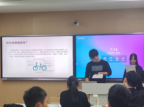 班会分为三个部分:介绍电动车、行车规范教育、总结与倡议。班会开始后,陈艺婷和朱万铸对电动车进行了全面的介绍,帮助不熟悉电动车的同学深入了解电动车的构造、原理、运行标准、时速等,以免各位同学对电动车了解不深入而产生畏惧心理。
