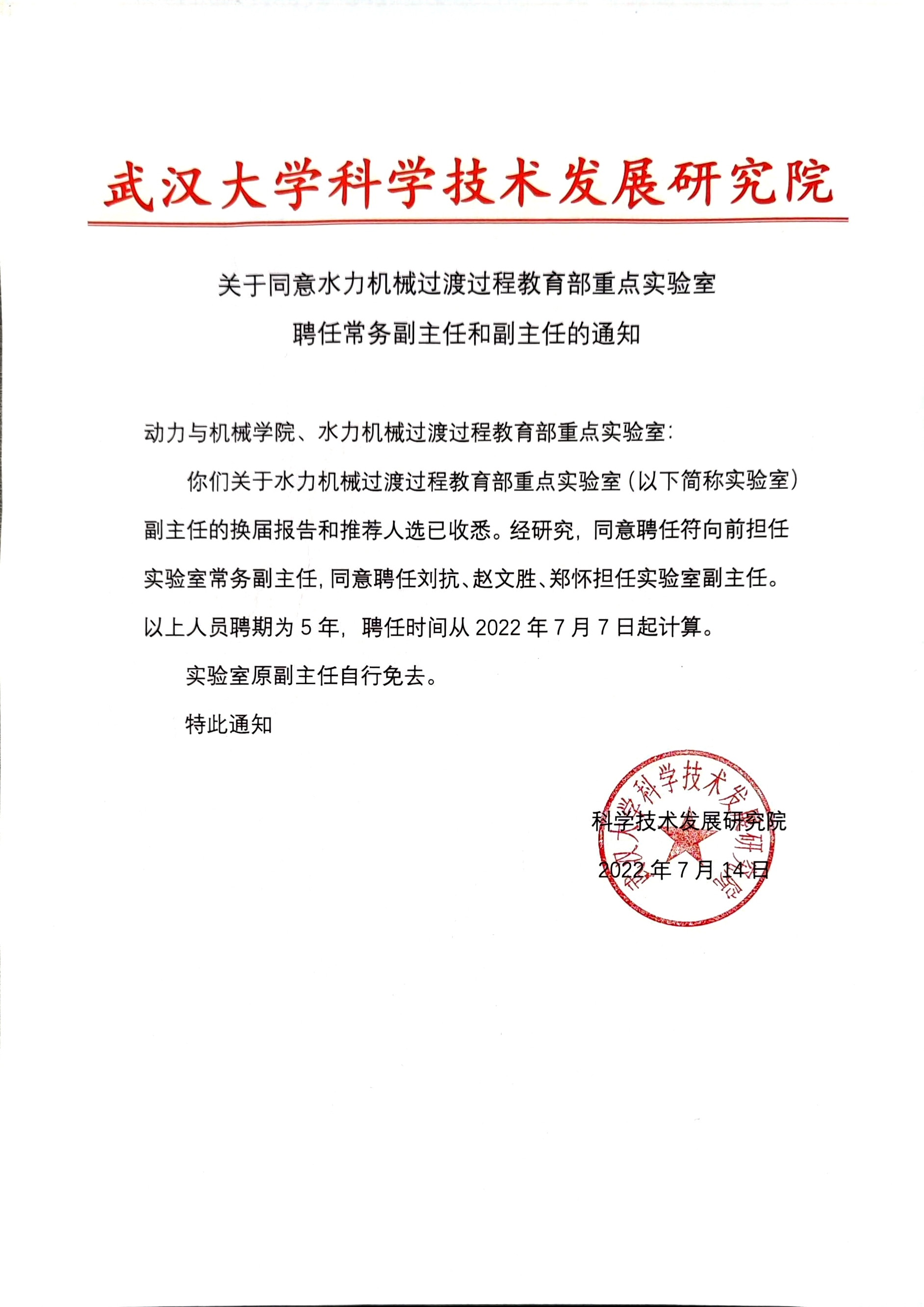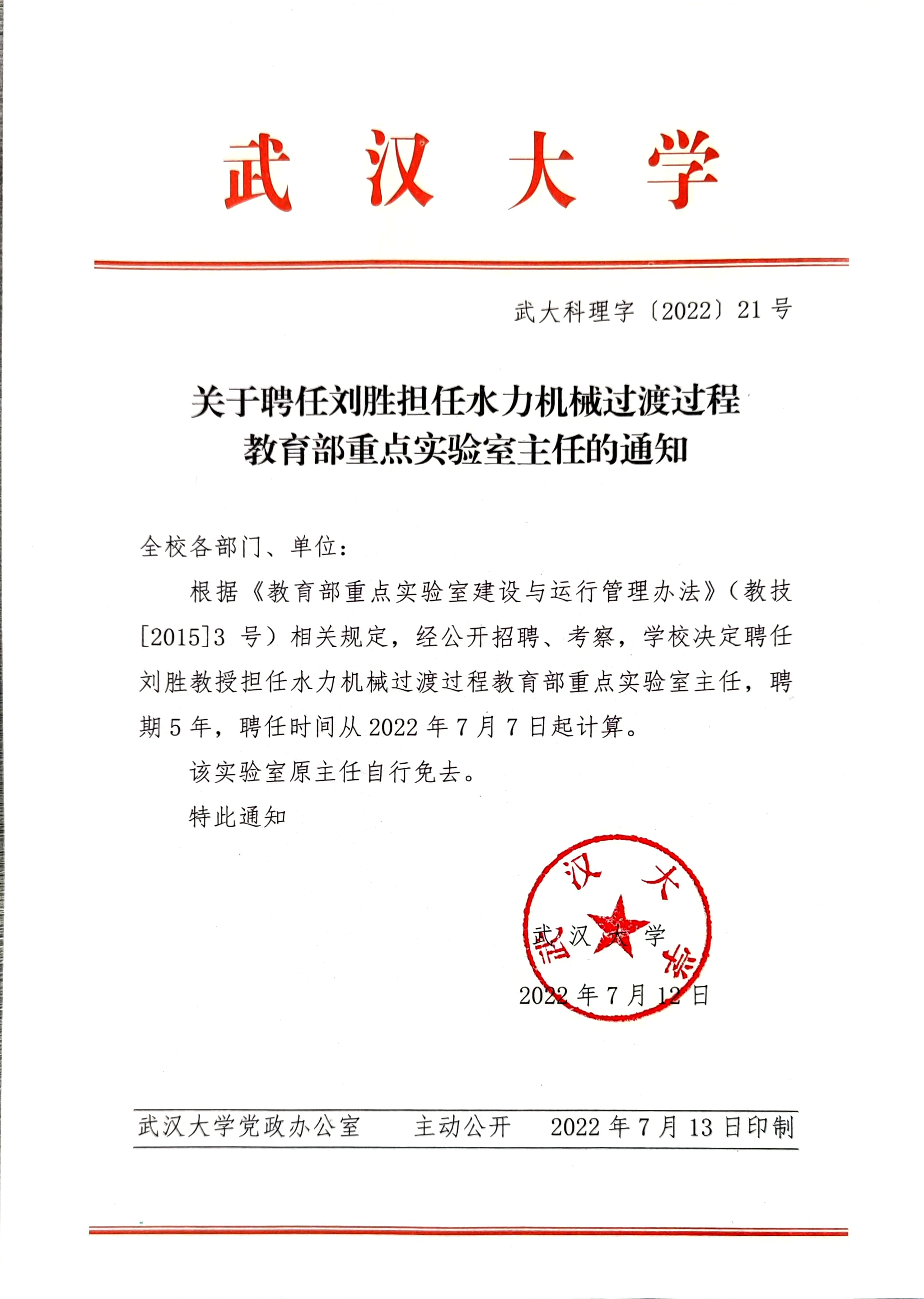 【bv伟德官网】关于聘任刘胜担任水利机械过渡过程教育部重点实验室主任的通知