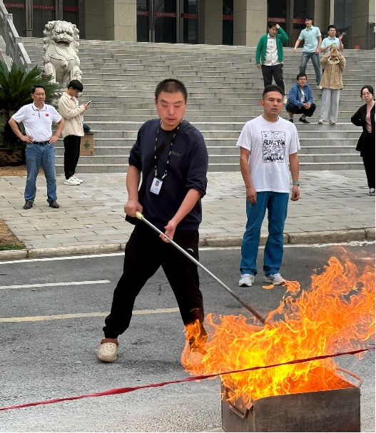随后,保卫部干事点起柴油火盆,亲自示范了如何使用干粉灭火器。师生们也在工作人员指导下有序体验了灭火的真实过程。在实操过程中,消防人员不时给予指导和纠正,确保每位参与者都能正确掌握灭火器的使用方法。通过实际操作,师生们掌握了正确的灭火技能,提高了应对火灾事故的能力,大家纷纷表示,这次活动生动有益,今后将增强消防意识,积极参与相关活动,共同维护校园的安全稳定。