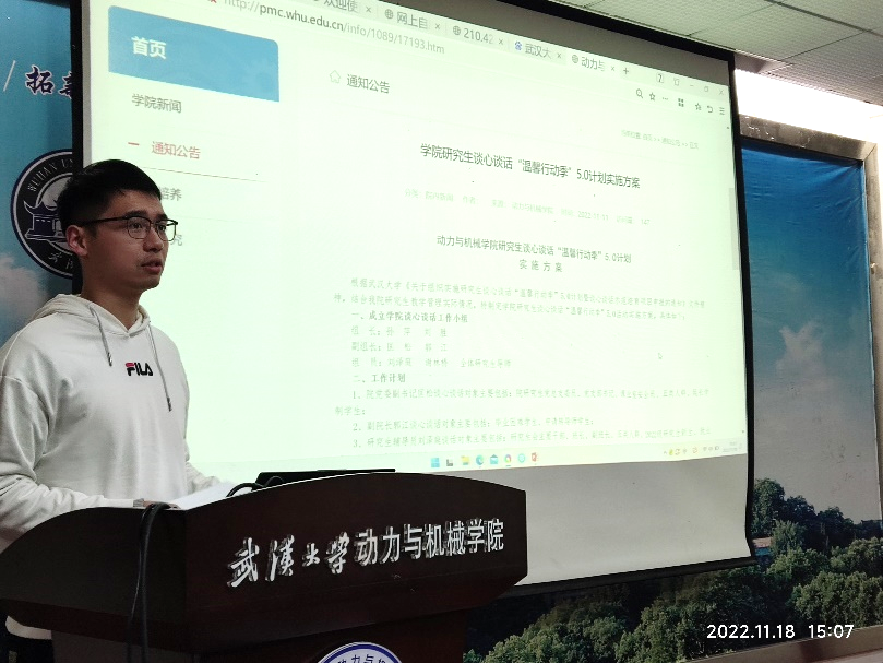 会议开始,刘泽庭详细地介绍了学院研究生谈心谈话“温馨行动季”5.0计划实施方案,对各实验室安全员进行了相关业务培训,要求各实验室切实做好温馨行动季工作。刘泽庭强调,同学们要充分利用学院研究生谈心谈话“温馨行动季”5.0计划契机,积极与导师交心谈心,解决自己学习生活中遇到的实际困难。
