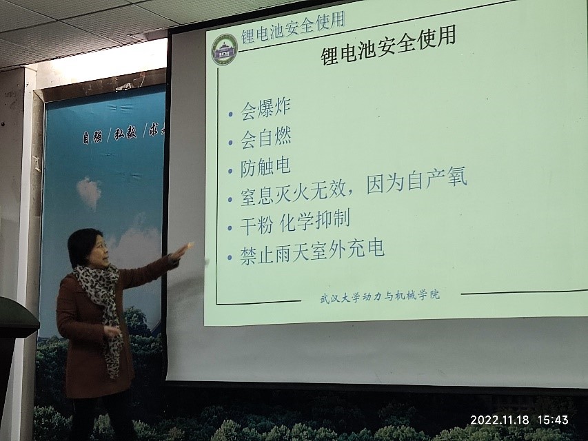 随后,廖冬梅以“锂电池安全使用”为主题开展了安全教育培训,主要介绍了锂电池安全使用要点以及突发事件的正确处理方式。廖冬梅强调,实验室安全关乎师生生命安全,是首要大事,同学们要严格落实不在实验室进行电动车充电、充电的试验设备一定要有人值守、下雨天室外不要充电、做好个人防护措施等等。