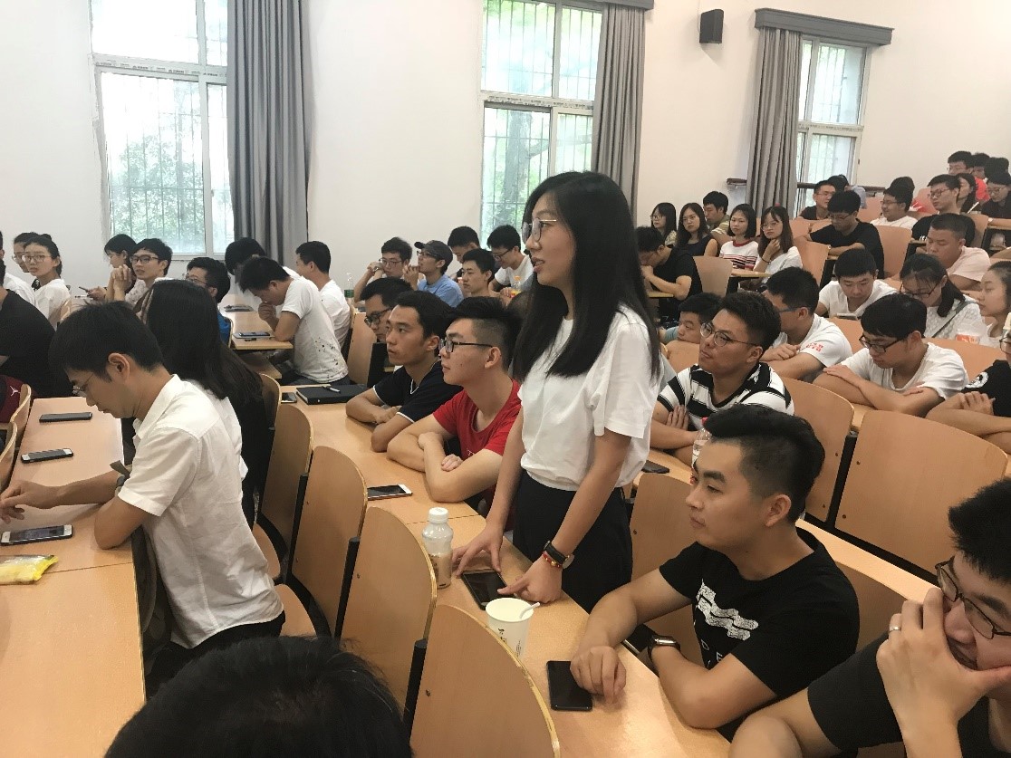 陈曦首先对各位新生的到来表示热烈欢迎,接着她从关键词“初心”开始,让三名同学分享他们来此读研的初心及自己人生的理想抱负,并以杰出员工雷军、院友阮立平和毛明激励同学们胸怀大志、见贤思齐。接着,她就研究生普遍的心理压力,即就业压力、学业压力、人际压力和婚恋压力一一提出解决方法。让同学们在面对消极情绪时学会正视接纳自己的情绪,及时合理宣泄情绪,建立自己的社会支持系统。她提供了学校学院在心理教育及咨询方面能提供的资源及信息,并留下自己的联系方式。最后,她祝愿新生能不忘初心,实现梦想,学有所成。