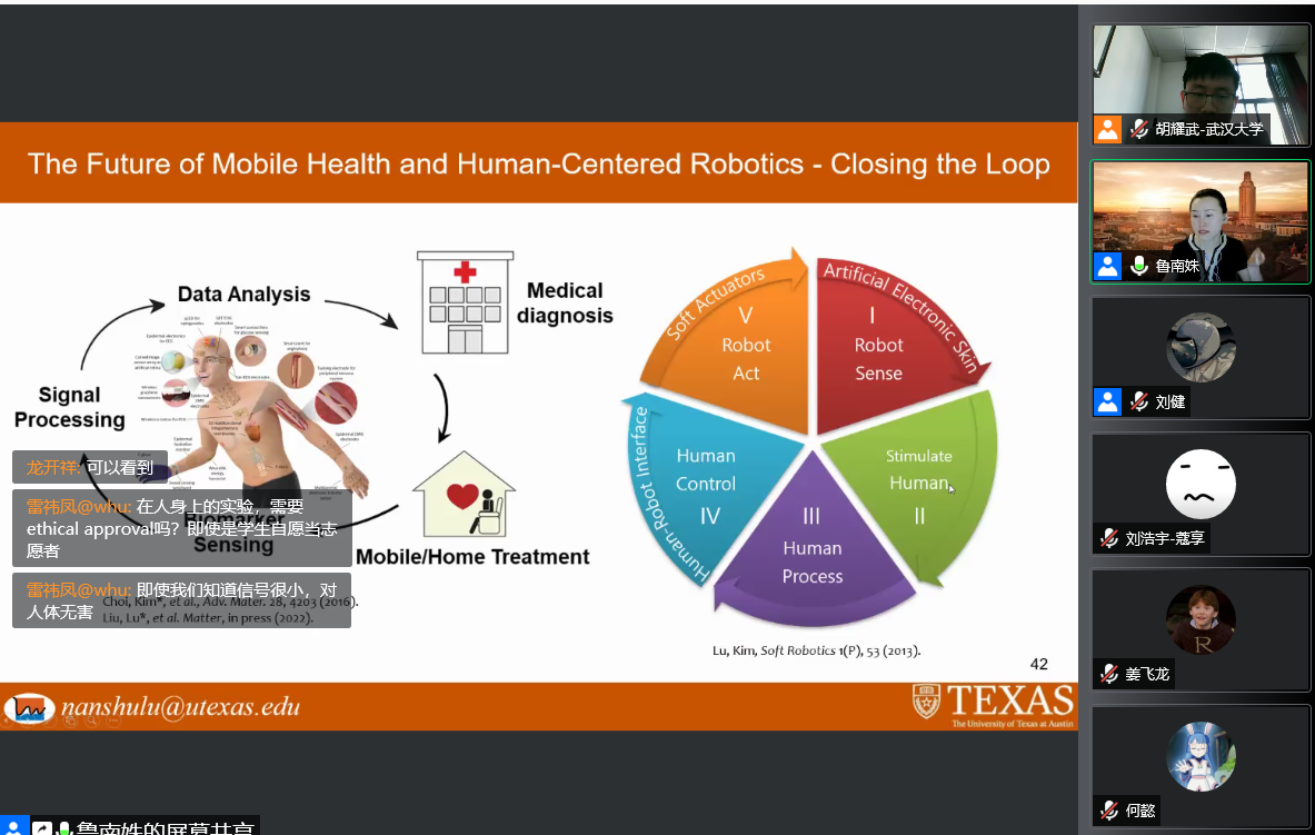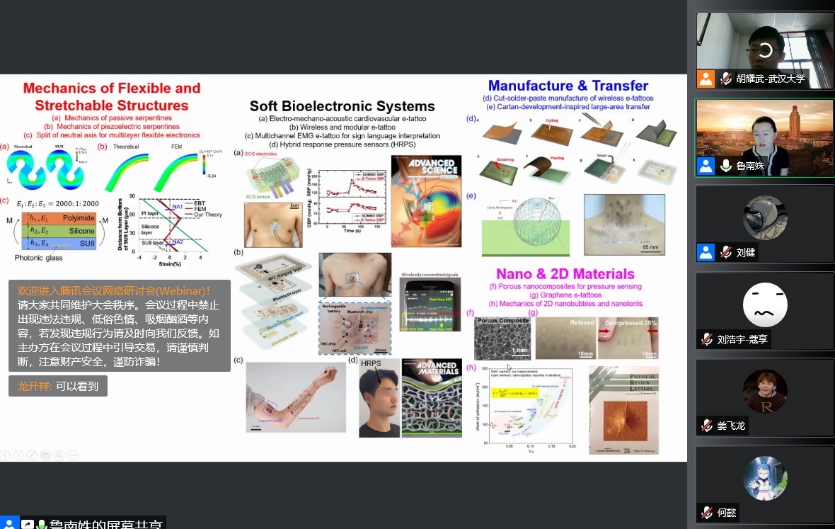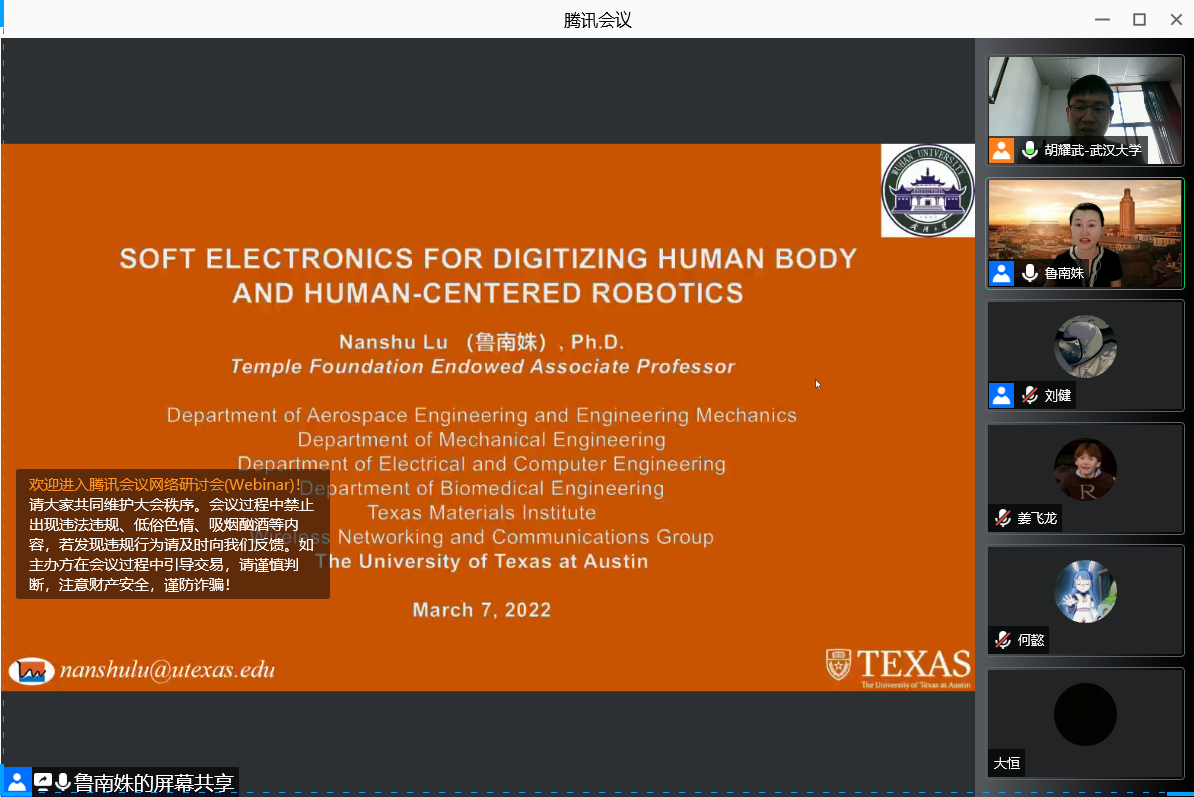 本网讯(通讯员:尚瑨 编辑:陈飏 审核:胡耀武、刘泽庭)3月7日中午,美国德州大学奥斯汀分校力学/机械等院系教授鲁南姝在公司通过线上会议的形式,举行“用于人体数字化和智能仿生机器人的生物电子元件”学术研讨会,学院副经理胡耀武及部分师生参加了本次研讨会,本次研讨会由胡耀武主持。