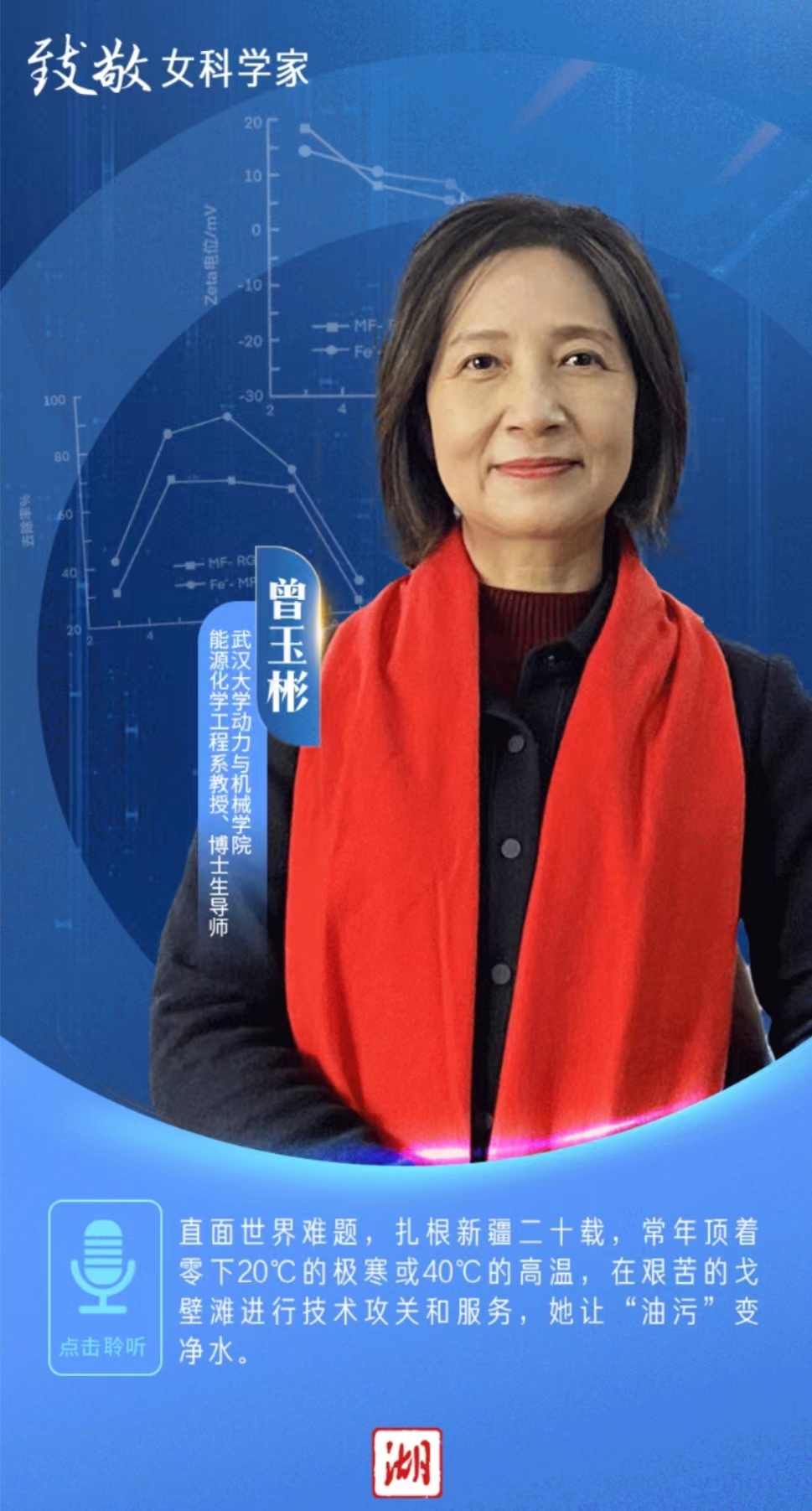 曾玉彬扎根新疆二十余载,致力于油田废水处理与资源化的科技攻关和社会服务。新疆油田地处戈壁荒漠,当地气候恶劣,生态脆弱,水资源极度匮乏,能源开采面临资源和环境的制约。她不畏艰难,常年顶着零下20℃的极寒或40℃的高温,克服漫天风沙和毒虫叮咬,穿梭在间隔数百公里的油田之间;她忍住工业污水的刺鼻和腐蚀,潜心攻关,聚焦能源企业技术难题和地方生态保护需要,突破性解决了石油复杂采出水处理的关键理论与技术难题,多次被中国环境报、中国石油报评价将污水“变废为宝”,不仅避免了环境污染、节约了淡水资源,更实现了油田绿色生产,在支援新疆建设“三基地一通道”的国家战略中做出了突出贡献。