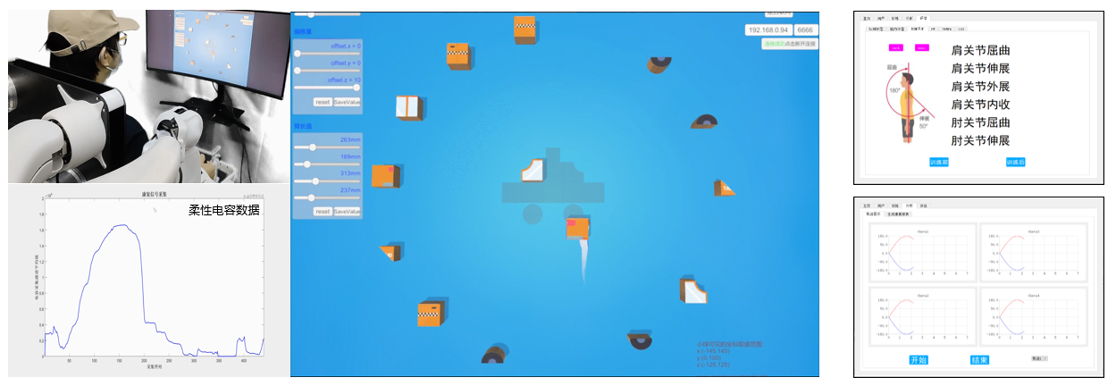 本研究还开发了多种机器人控制模式:主动助力模式、辅助助力模式以及阻抗模式,分别适用于患者上肢康复训练阶段中的急性期、恢复期以及保持期。开发了人机交互虚拟现实康复训练软件,设计的VR游戏可提高患者训练的积极性,并可以进行康复训练效果评估。目前团队与bv伟德官网中南医院、人民医院合作,正在开展康复机器人的临床应用研究,并与湖北省残疾人辅助器具资源中心合作,开展机器人的居家康复应用推广。